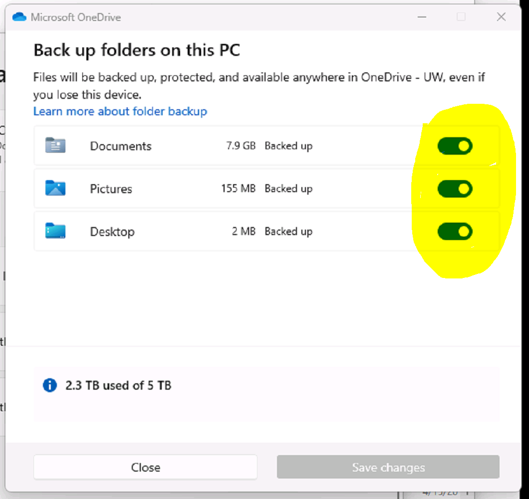 When first initiating OneDrive the user should enable folder backup and turn on backups for: Documents, Pictures, and Desktop by moving the on/off dot to the right.